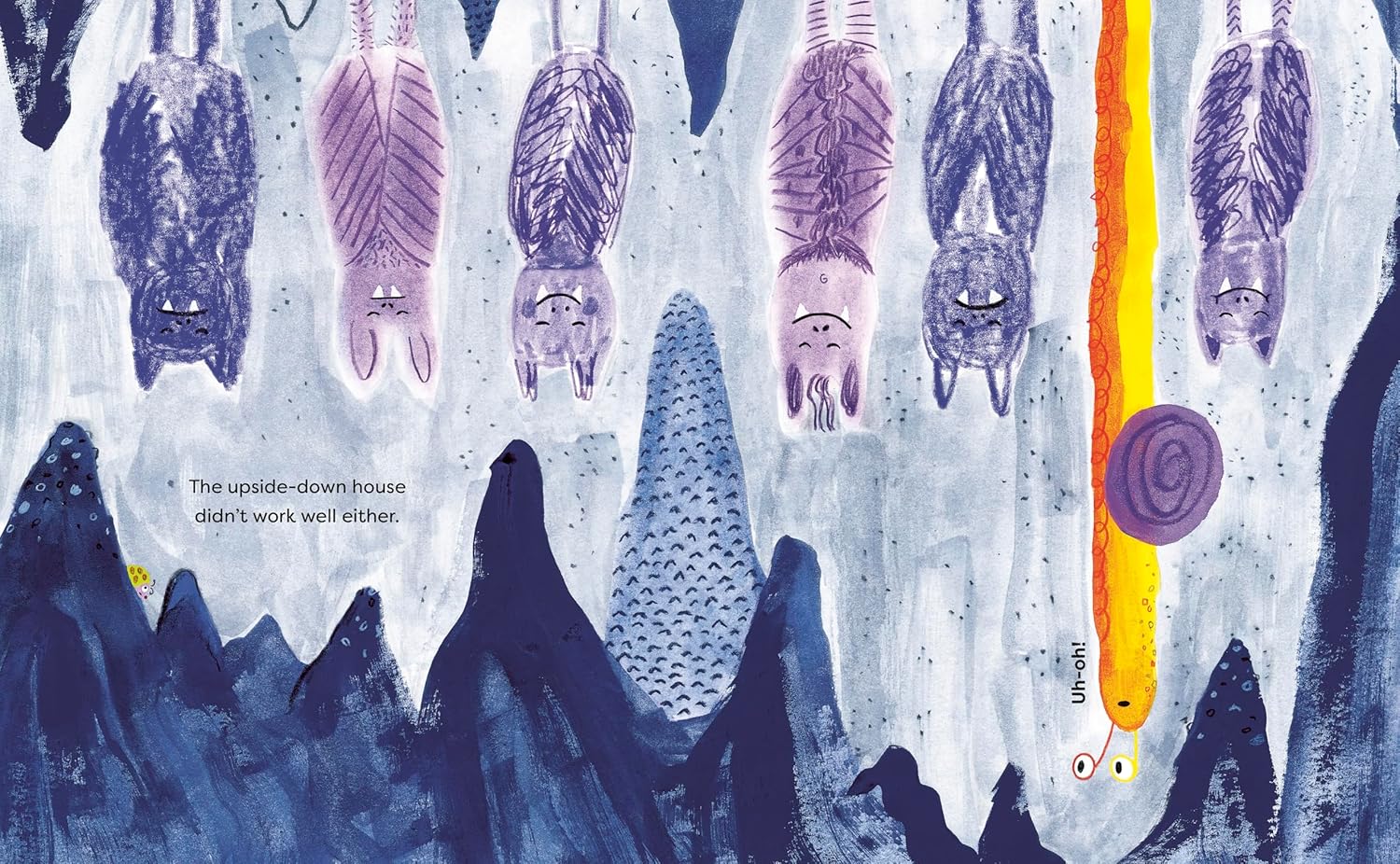 Follow a little snail on her thoughtful and amusing quest to find a new house. Little Snail tries out a hilarious array of unexpected homes, completely unlike a snail shell! She tries hanging upside down with bats – a little uncomfortable – and a busy burrow packed with many, many rabbit roommates!