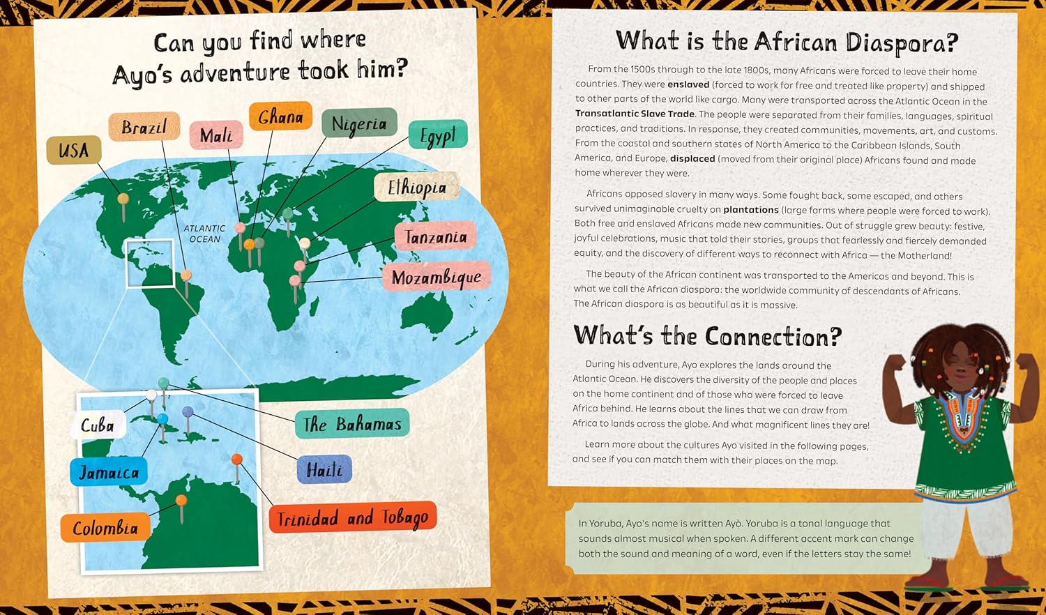 As a lifelong literacy advocate, I seek out children’s books that help kids explore the world around them. Ayo’s Adventure is a journey through the sights and sounds of the African diaspora. I loved hanging out with Ayo on his adventure. I learned so much.” - LeVar Burton, Actor + Children’s Literacy Advocate When Ayo struggles to fall asleep, he tumbles into an extraordinary journey across the African diaspora, where he experiences creative and resilient cultures that share his heritage. From hip-hop to kente cloth, from Mansa Musa to revolution, the African diaspora has inspired the world! Endmatter further explores connections between the nations, cultures, and traditions represented on both sides of the Atlantic, for a deeper understanding of the African diaspora.