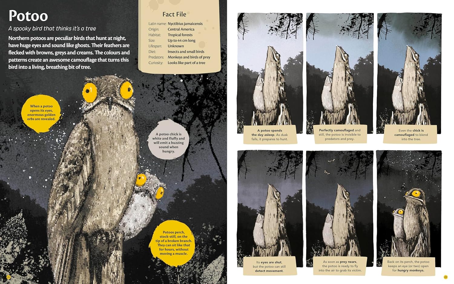 Bite-sized text breaks down key information about the creature’s appearance, behaviour and habitat, while colourful and dynamic illustrations by Fiona Fogg bring the animal to life in front of you. Each animal also features bold graphic-novel style panels that tell the story of a key aspect of each animal’s daily life, such as the aye-aye foraging for its dinner and the peacock spider performing a dramatic dance to attract a mate.