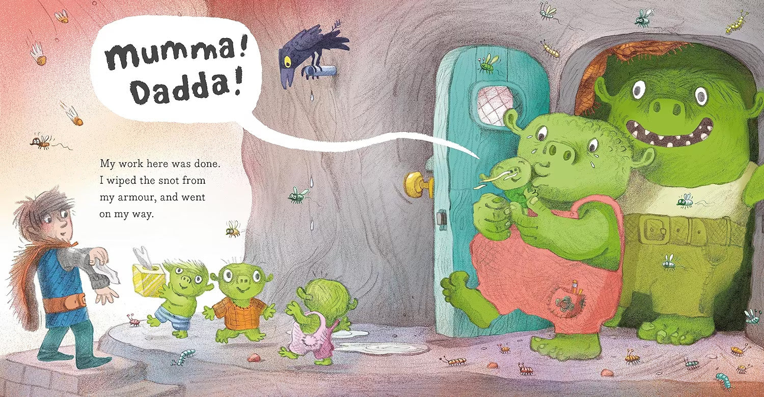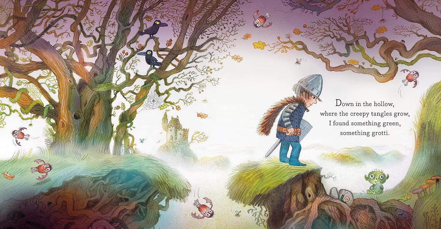 Down in the hollow, where creepy tangles grow, a knight finds something green, something grotti. He explains that he can’t stay because he is very busy (“I’ve got beasts to battle and kingdoms to defend!”). But he can’t just leave this sad, lost – and very big-eyed! – baby monster, can he?