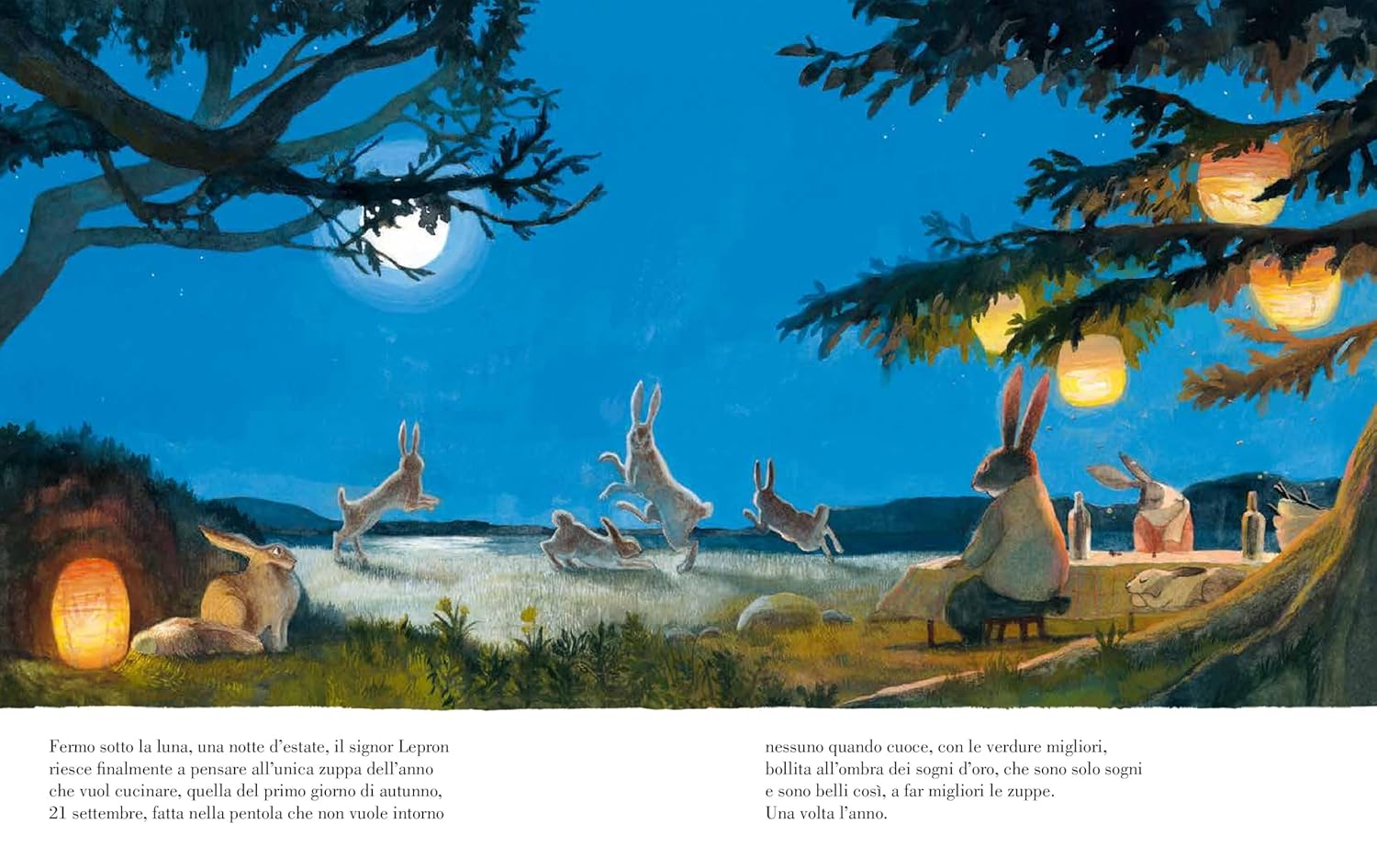 Mr Lepron, a grey hare, lives in the forest and has a toasty warm home and many children, grandchildren and great-grandchildren. Oh, and he adores vegetables and making soup. Mr Lepron also enjoys napping and he always dreams of being a famous chef, cooking his magnificent soup. After his vivid, fantastical dreams, Mr Lepron's soup tastes out-of-this-world irresistible. So irresistible, that Mr Lepron becomes famous. So irresistible, that Mr Lepron opens a soup factory that starts working around the clock. But as his dreams turn to nightmares about the factory, Mr Lepron's soup loses its magical flavour, and he realizes that what matters most in the world is not fame and riches, but time spent with his beloved children, grandchildren and great-grandchildren, playing, laughing, napping and, sometimes, cooking his soup ... with love.