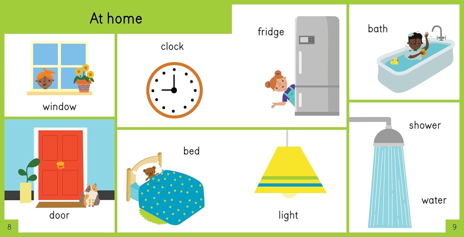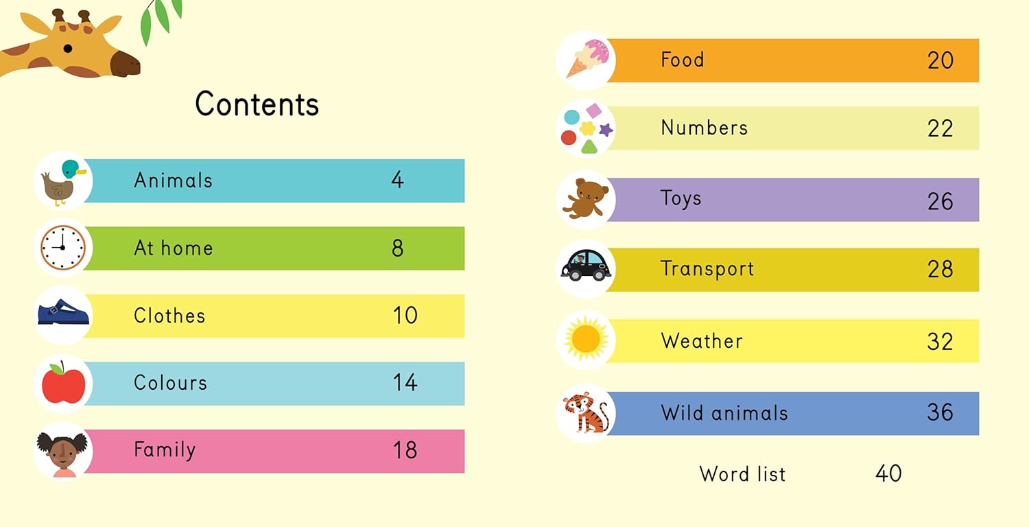 Bring first English words to life with this charming hardback book perfect for sharing together. There are words for animals, at home, clothes, colours, family, food, numbers, toys, transport, weather and wild animals. Plus a list of words at the back of the book, in case you want to look something up. Discover the joy of learning English together!