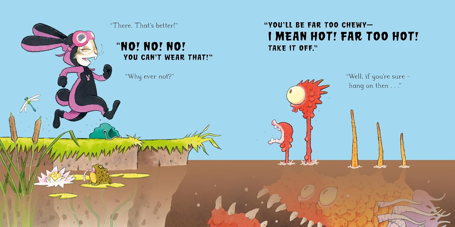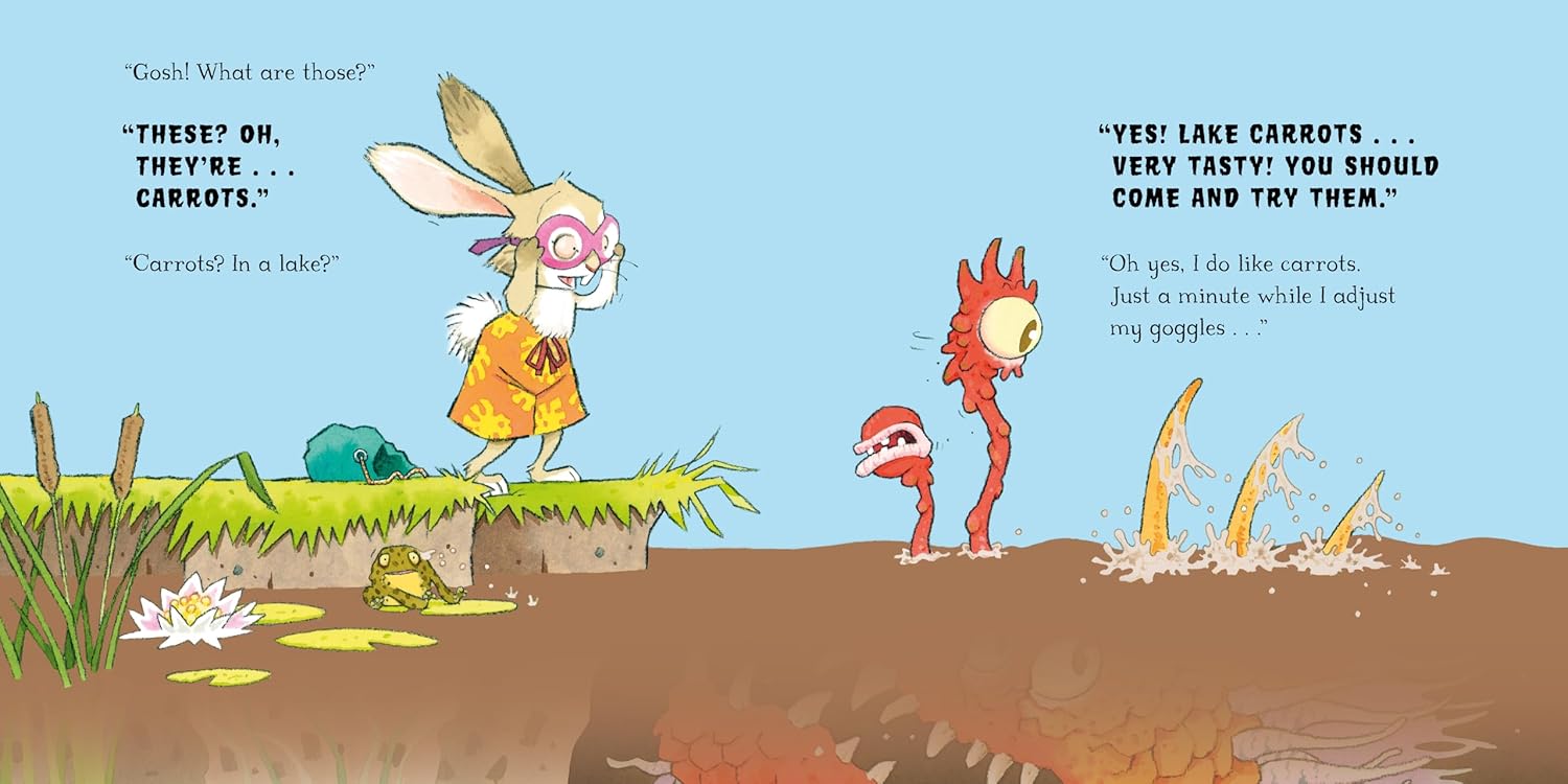 When a rabbit meets a sneaky sea monkey trying to get him into the water, he has questions; lots of them! What are carrots doing in a lake? Why are there no fish? Is the water cold? And, most importantly, is the sea monkey really a sea monkey? He certainly is a strange-looking fellow . . .