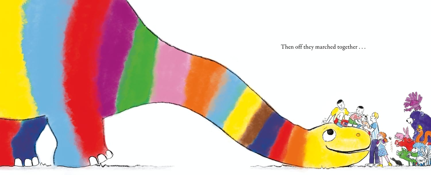 Join two dads and their three children as they set off on an adventure to find the Rainbowsaurus. On their way, they meet animals that are all the colours of the rainbow who all want to find the Rainbowsaurus, too. From the author and illustrator of the Mr Panda series and The Queen's Hat collection, comes this instantly classic-feeling adventure.