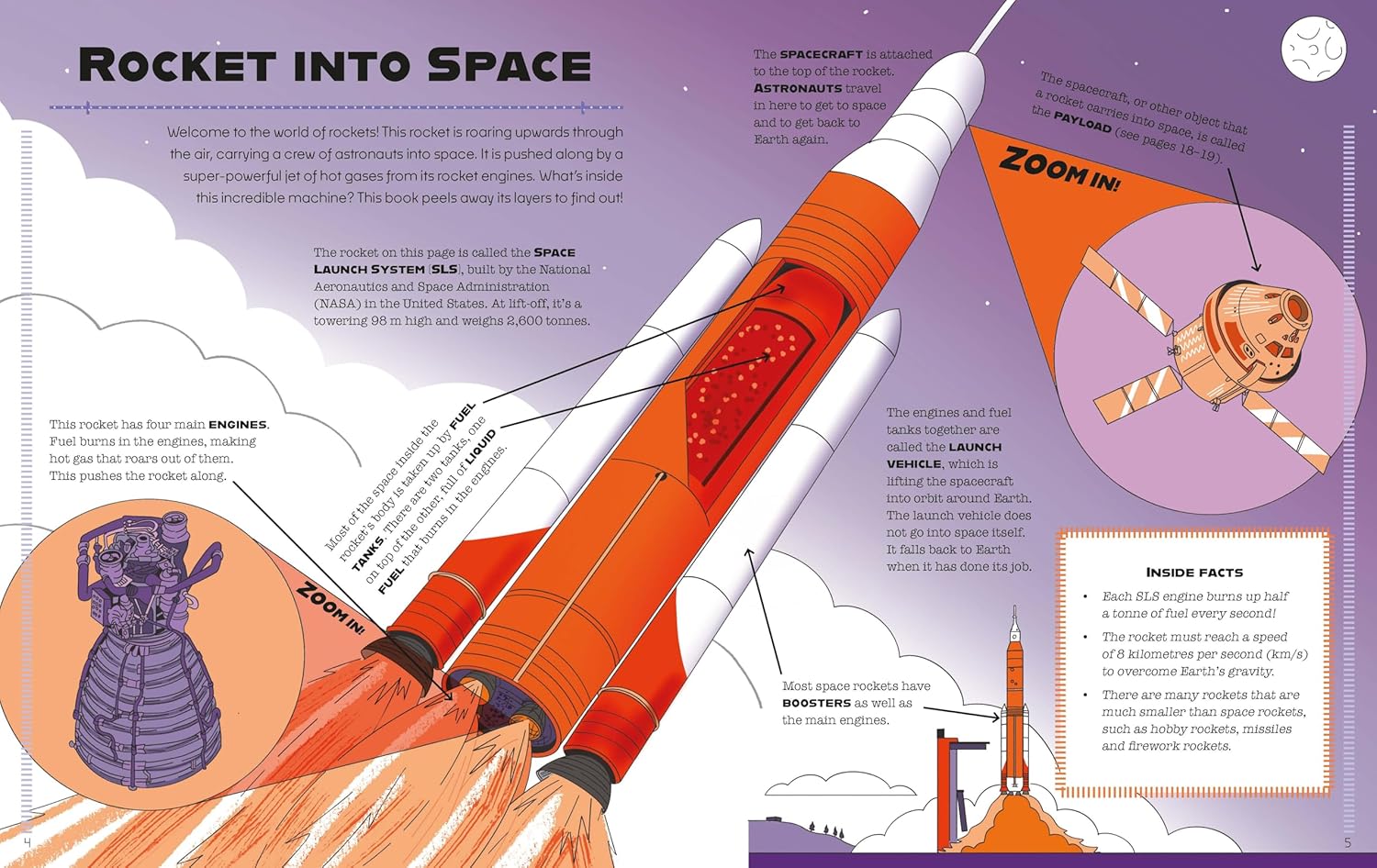 Inside Info: Taking Apart a Rocket is a feast of facts, figures, diagrams and details with no layer unexplored. Pull apart all the rocket's stages, fuel tanks, engine parts, boosters, thrusters, exhaust systems, on-board controls, crew modules, escape systems, even space suits and splash-down parachutes!