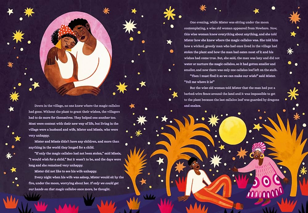 Long ago and far away, a magic callaloo plant grew in a village square. Whoever ate one of its leaves was granted a wish. But a greedy, selfish man wanted all the wishes for himself, so he stole the callaloo. With only one leaf left, Mister and Missus, desperate for a child, pluck it to make their dream come true. But the greedy man wants everything, and he kidnaps their beloved daughter, who will ultimately make the most remarkable escape.