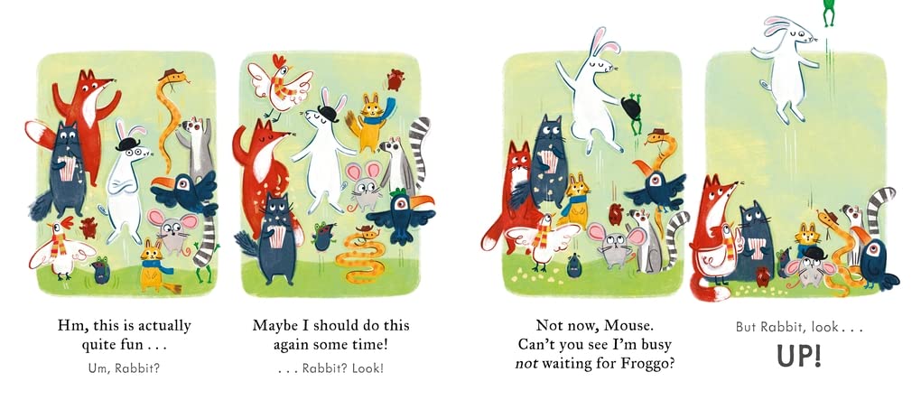 "What's a Froggo?" Mouse asks. "When will they get here? What do they look like?" Rabbit urges Mouse to wait but as more animals show up to join them, things start to get more busy and chaotic. Just as Rabbit is about to lose his temper, Mouse asks the biggest question: what if Froggo doesn't come?I