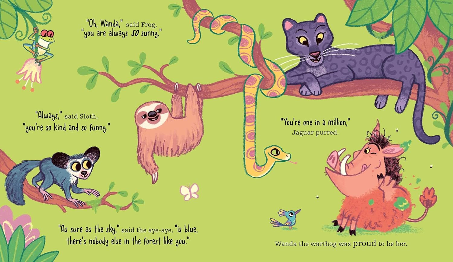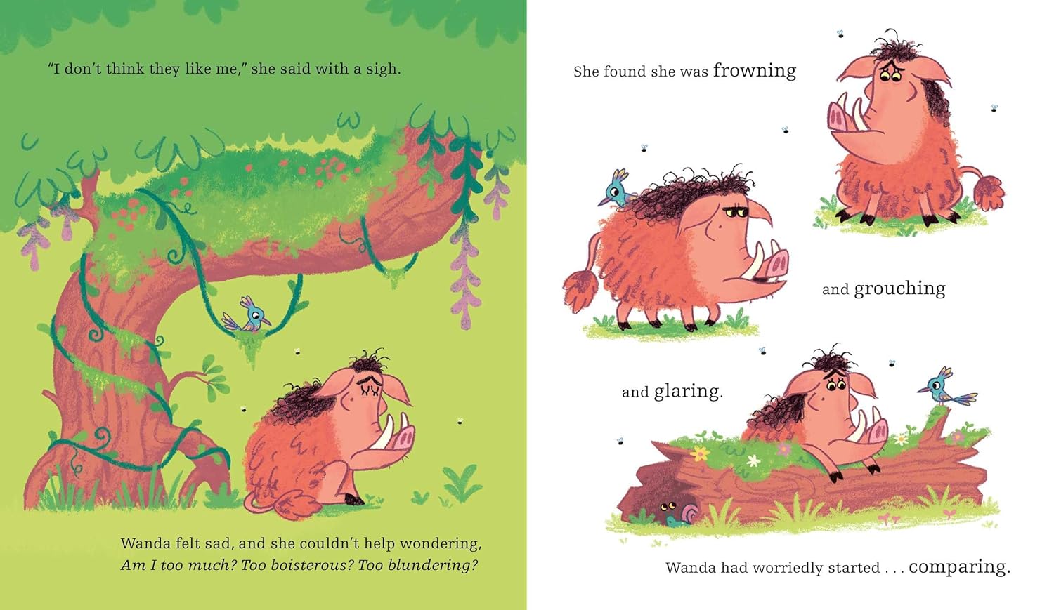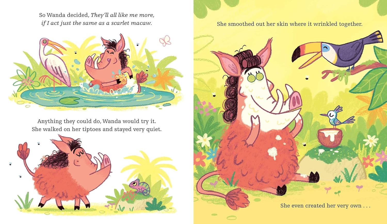 Wanda the warthog is perfectly proud to be HER – a root-rustling wonder with stubbly fur. But when a graceful, perfectly plumed rainbow of scarlet macaw parrots appear in the forest one day, Wanda suddenly starts to doubt herself… Frowning and grouching and glaring: Wanda the warthog has started comparing.