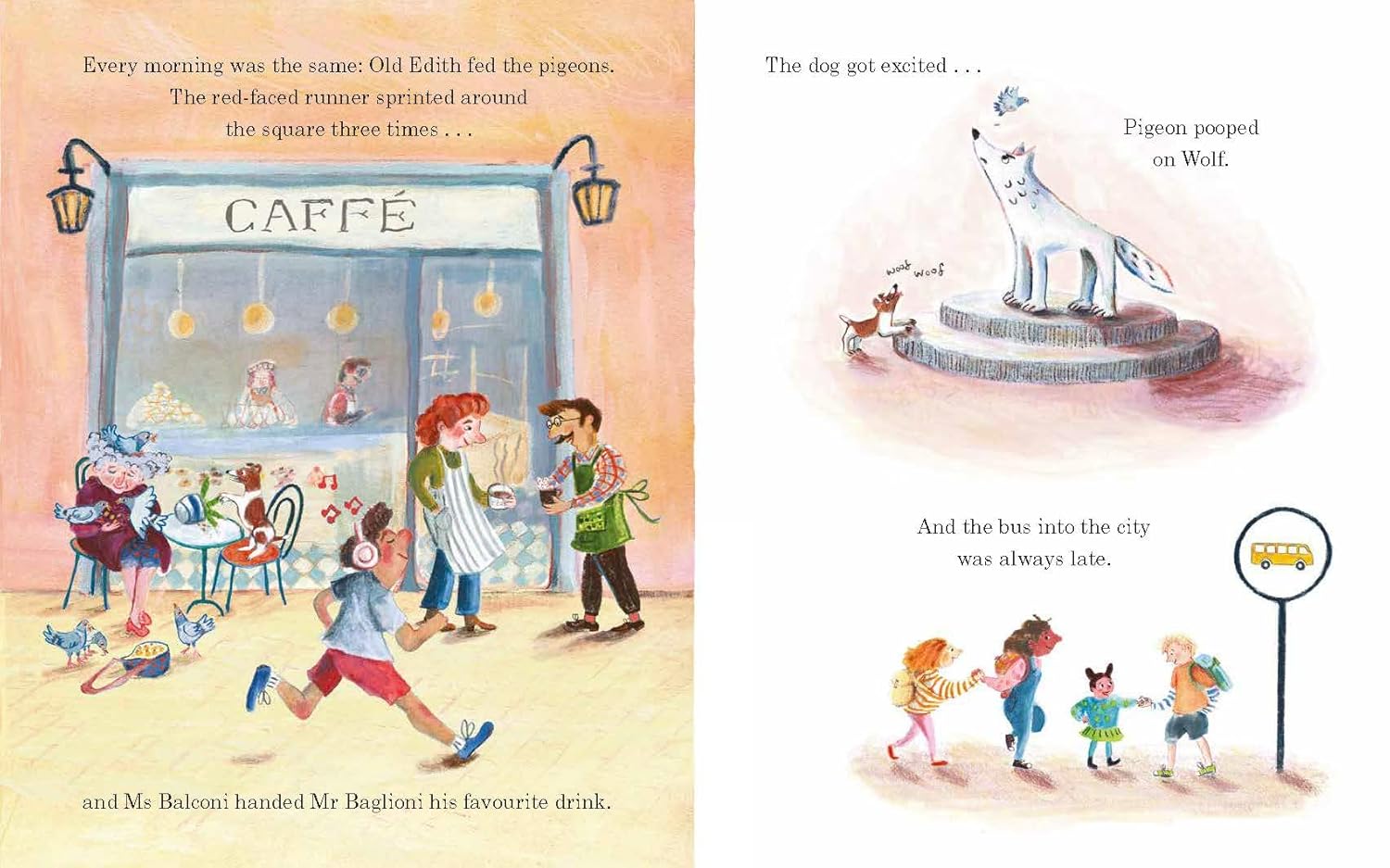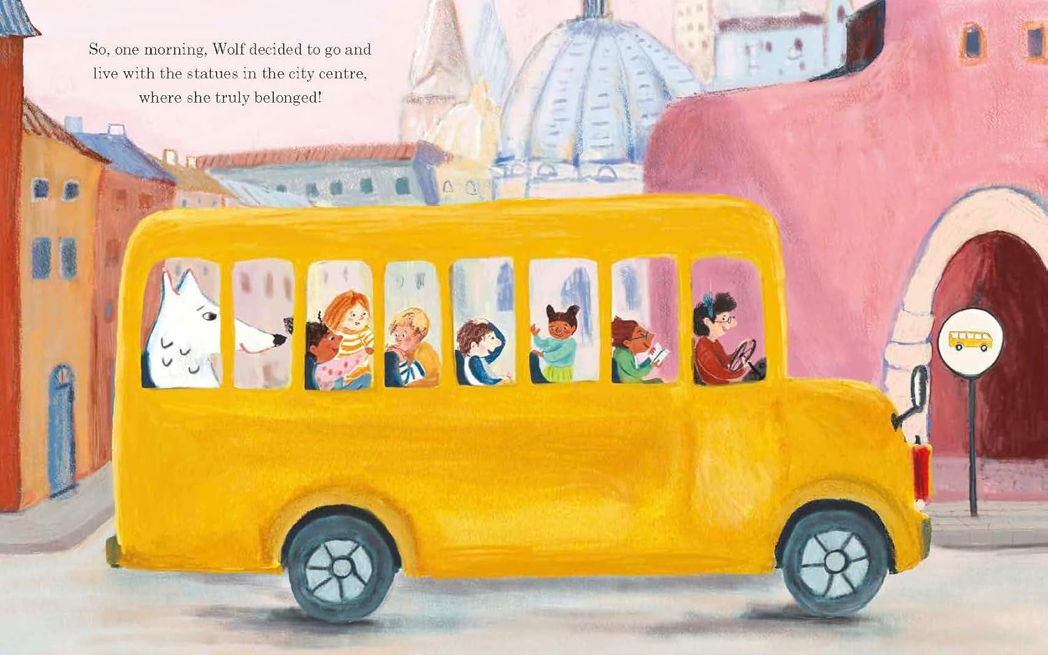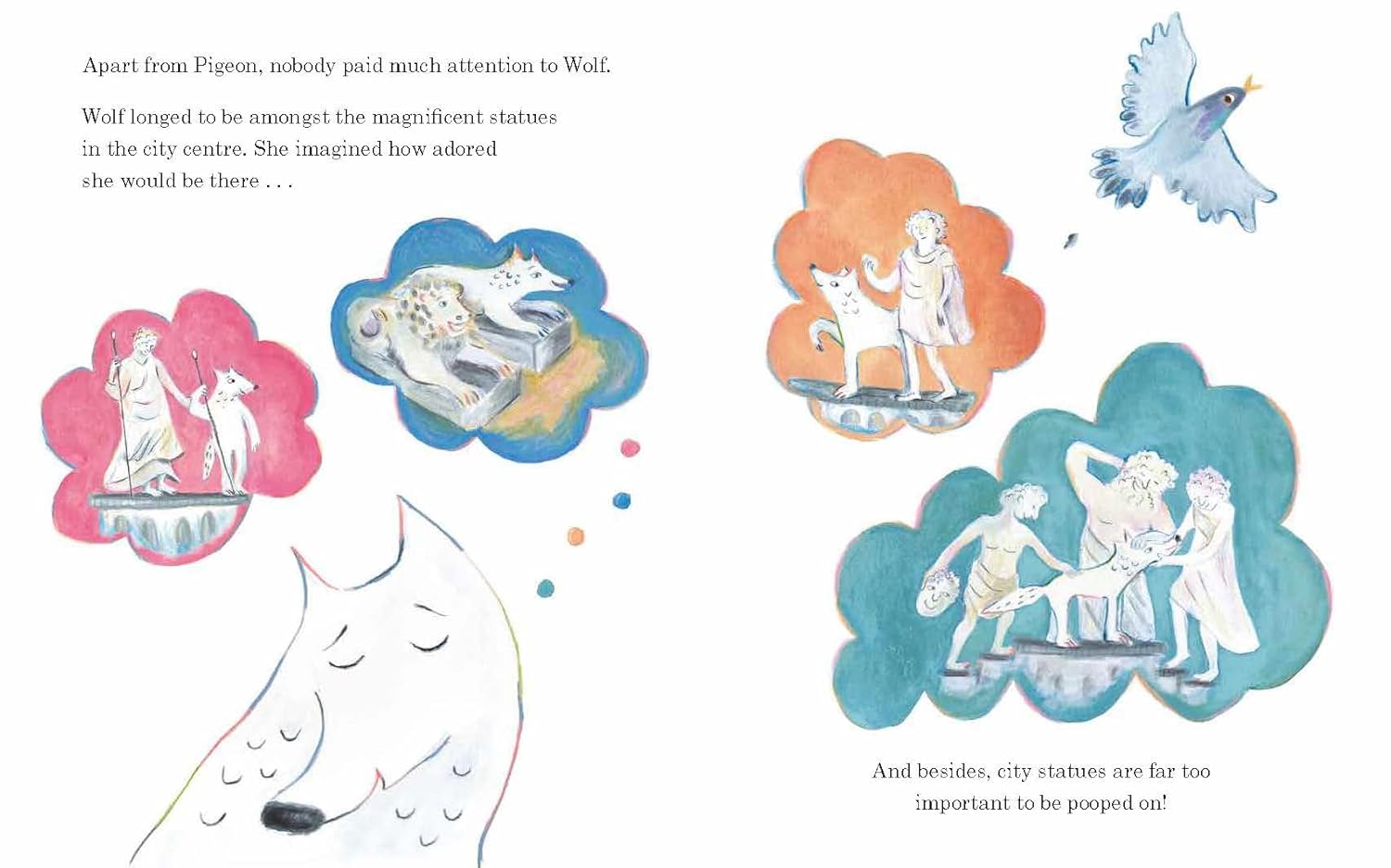 Wolf lived on a plinth in a tired old square on the edge of a vast and magnificent city. Taken for granted and pooped on by Pigeon, she longs to be admired and to find her place amongst the famous statues in the City Centre. One day she sets off on the bus to do just that, but she discovers that the city statues are mean and selfish. Wolf soon realises that she misses home, and heads back to her old square only to find that her friends there have missed her just as much.